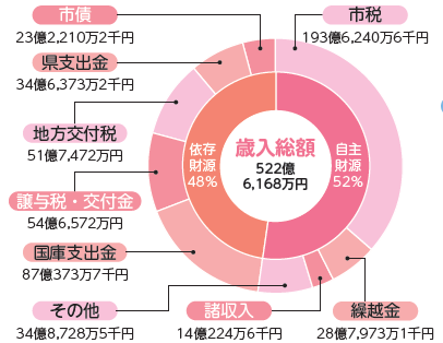 歳入は522億6,168万円、歳出は494億4,239万1千円で、差し引きは28億1,928万9千円でした。この中には、令和7年度へ繰り越すべき財源として6億2,392万3千円が含まれていますので、令和6年度の実質収支は21億9,536万7千円となりました。