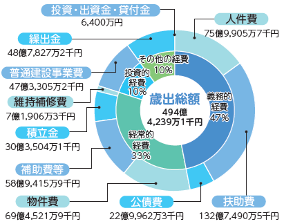 義務的経費:人件費、扶助費、市債の元利償還金で、支出が義務付けられ、任意に削減したり圧縮したりできない経費