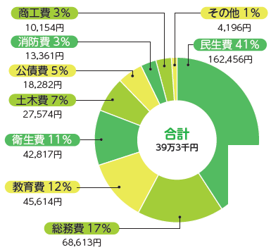 衛生費:健康診断や予防接種、環境保全対策、ごみ、し尿処理など衛生的な生活環境を保つ経費