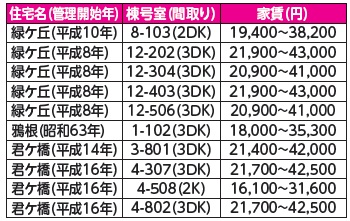 ※今回募集する住宅のうち、緑ケ丘住宅8棟103号および君ケ橋住宅4棟508号は単身の高齢者、障がい者または生活困窮者等の申込みが可能です。それ以外の住宅については、同居する親族がいる方のみ申込みができます。
