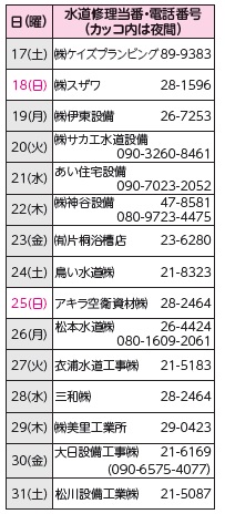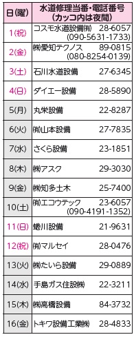 くらし 水道修理当番(緊急時のみ)について(令和8年1月) 46/54 前の記事 次の記事 発行日 : 2025年12月01日 自治体名 : 愛知県半田市 広報紙名 : はんだ市報 2025年(令和7年)12月号(NO.1587) ■水道修理 敷地内で緊急な漏水の修理等が必要な場合にご相談ください。それ以外は、半田市指定工事業者からお選びください。修理費用は原則、お客様のご負担となります。 ページ番号:1003479 Tweet シェアする 緊急医療機関について(令和8年1月) 人口と世帯(令和7年11月1日現在)