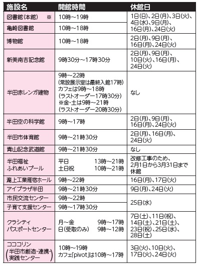 くらし 公共施設の開館情報(2月) 46/50 前の記事 次の記事 発行日 : 2026年01月01日 自治体名 : 愛知県半田市 広報紙名 : はんだ市報 2026年(令和8年)1月号(NO.1588) ※2月1日(日)から4日(水)の図書館休館に伴う本館学習スペースの開放状況は、市ホームページをご覧ください。 Tweet シェアする 4月〜11月のごみ量 二十歳を迎えられたみなさん、おめでとうございます!令和8年 半田市二十歳の集い