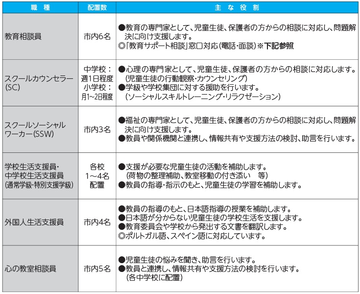 お子様の学校での学習活動や日常生活を支えるために、市では様々な役割の人たちがお子様や保護者のみなさまに関わっています。