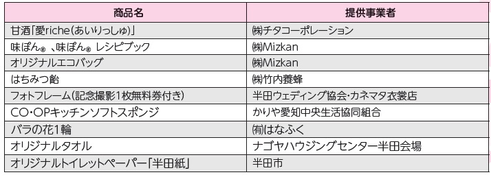 いつもは7品ですが、“いい夫婦の日”は、さらにバラの花、オリジナルタオルを追加した全9品のお祝い品をお渡しします。お祝い品はすべて事業者からの寄贈で集まりました。