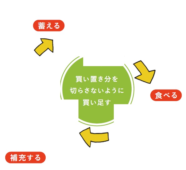 ローリングストックとは、いつも食べている食品を少し多めに買い置きしておき、食べた分だけ買い足すことで食料備蓄ができる方法のことです。「防災=特別なこと」ではなく、日常の延長で続けることができます。