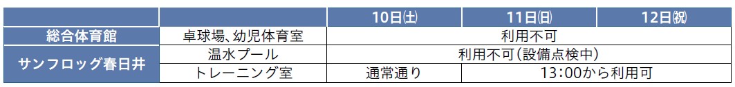 くらし 1月10日(土)~12日(祝)の施設利用のお知らせ 7/41 前の記事 次の記事 発行日 : 2026年01月01日 自治体名 : 愛知県春日井市 広報紙名 : 広報春日井 令和8年1月号 施設利用の問合せ: 総合体育館 【電話】84-7101 サンフロッグ春日井 【電話】56-2277 Tweet シェアする 新春春日井マラソン大会交通規制などのお知らせ わいわいカーニバル協賛とキッチンカーの募集