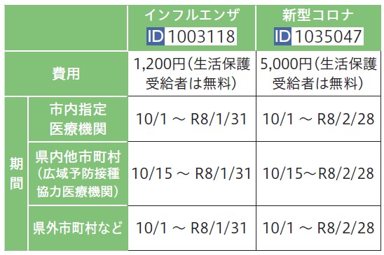 注意事項:インフルエンザ、新型コロナのいずれも接種券の送付はありません。市内の指定医療機関に直接予約してください。