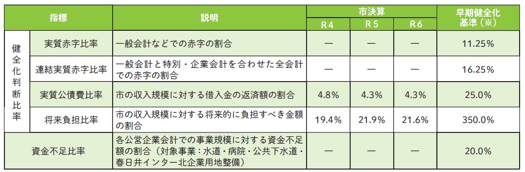 財政健全化判断比率は、財政の早期健全化や再生の必要性を判断するための指標です。本市の指標は、いずれも基準を超えないものとなりました。今後も、年度ごとの指標の推移や算出の基礎となる数値を分析することで財政運営の課題を明らかにし、自主的かつ計画的な財政運営に努めます。