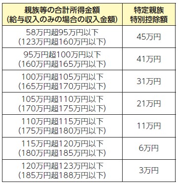 特定親族特別控除が創設され、生計を一にする年齢19歳以上23歳未満の親族等(配偶者および青色事業専従者等を除く)で、前年の合計所得金額が58万円超123万円以下の方がいる場合に所得控除の適用を受けられます。控除額は、親族等の所得に応じて下記の額となります。