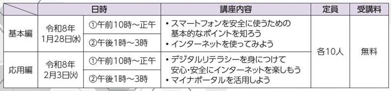 スマートフォンを安全に使うための基本的なポイントとマイナポータルのサービス等暮らしに役立つ使い方を学べる講座です。
