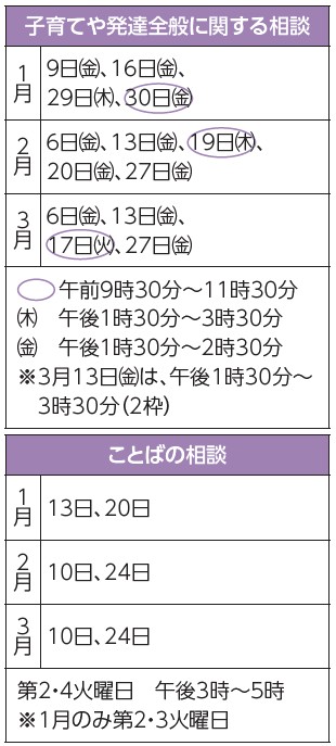 子育てやお子さんの発達で心配なこと、困っていることはありませんか。専門職員が子育てや発達、ことばに関する相談を受け、アドバイスや必要に応じた支援を無料で行います。