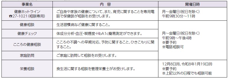 ・暴風警報等が、愛知県西部地方に発令された場合は実施できないことがありますので、保健センターにお問い合わせください。