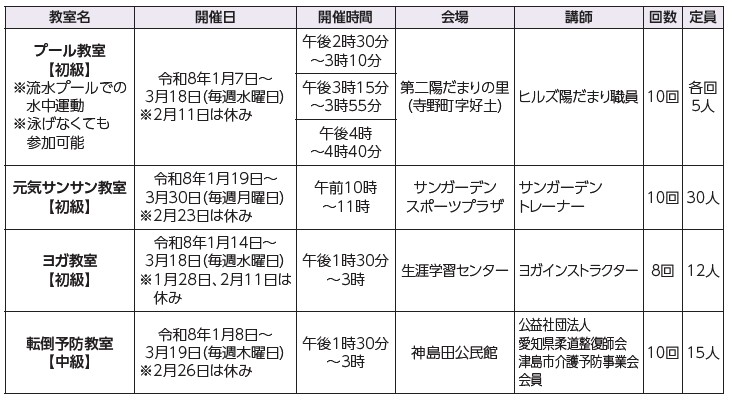 申込:12月1日(月)~8日(月)に電話または直接問い合わせ先へ(応募者多数の場合は、初めて参加する方、要介護認定をお持ちでない方を優先の後、抽選)。
