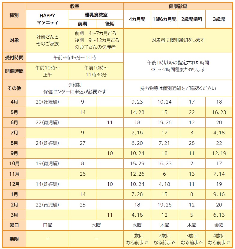 ・暴風警報等が、愛知県西部地方に発令された場合は実施できないことがありますので、保健センターにお問い合わせください。