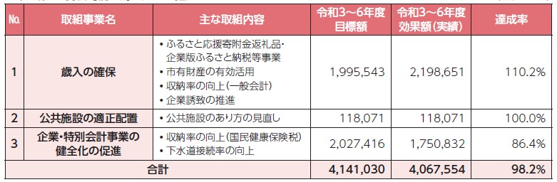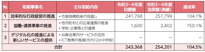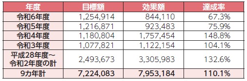 令和6年度は、目標額1,254,914千円に対し、効果額844,110千円となり、平成28年度から令和6年度までの9カ年では、7,953,184千円の効果額となりました。