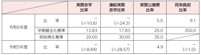 令和6年度決算に基づき算定された津島市の健全化判断比率および資金不足比率は、下表のとおりです。前年度に引き続きすべて基準を大きく下回っており、財政状況は健全な状態にあると言えます。