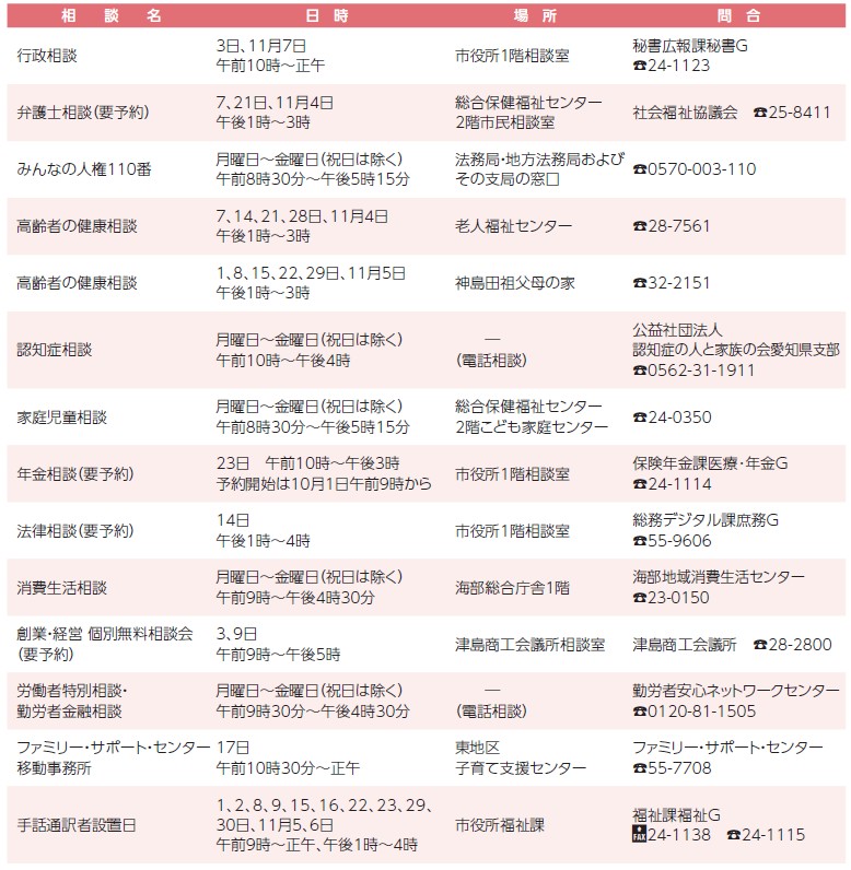 くらし 10月市民相談 17/47 前の記事 次の記事 発行日 : 2025年10月01日 自治体名 : 愛知県津島市 広報紙名 : 市政のひろば つしま 令和7年10月号 ※相談員の都合により相談を休むことがありますので、当日、電話でご確認ください。翌月7日分まで掲載。 ※予約制の相談は、受付件数が限られていますので、ご希望の日時に相談できない場合があります。 Tweet シェアする 下水道についてのお願い 津島データファイル