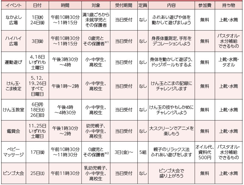 ・定員のあるイベントの受付は、電話または直接児童館まで(定員になり次第受付終了)