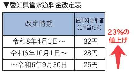 県営水道使用料金単価の値上げにより、令和5年度実績と比較し、令和6年10月1日の値上げで年間1,400万円、令和8年4月1日の値上げで年間4,100万円の県営水道受水費用の増加が見込まれます。