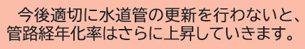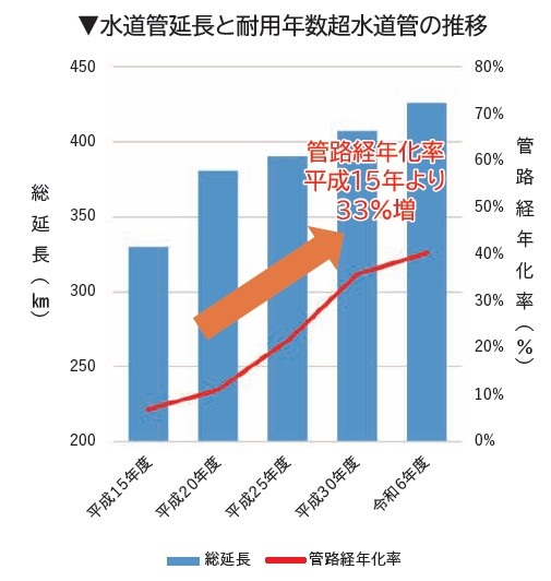 水道事業経営を維持するためには、管路や施設等の更新をしないと、老朽化した水道管からの漏水や、断水の発生リスクが高まります。さらには、大規模地震等の災害が発生した場合に配水施設が機能不能となれば、災害からの復旧が大幅に遅れる可能性があります。