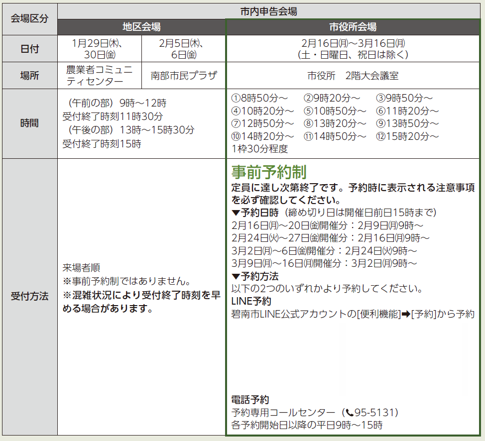 ・市役所会場について、予約済みでも当日の申告受付状況により案内が遅れる可能性があります。
