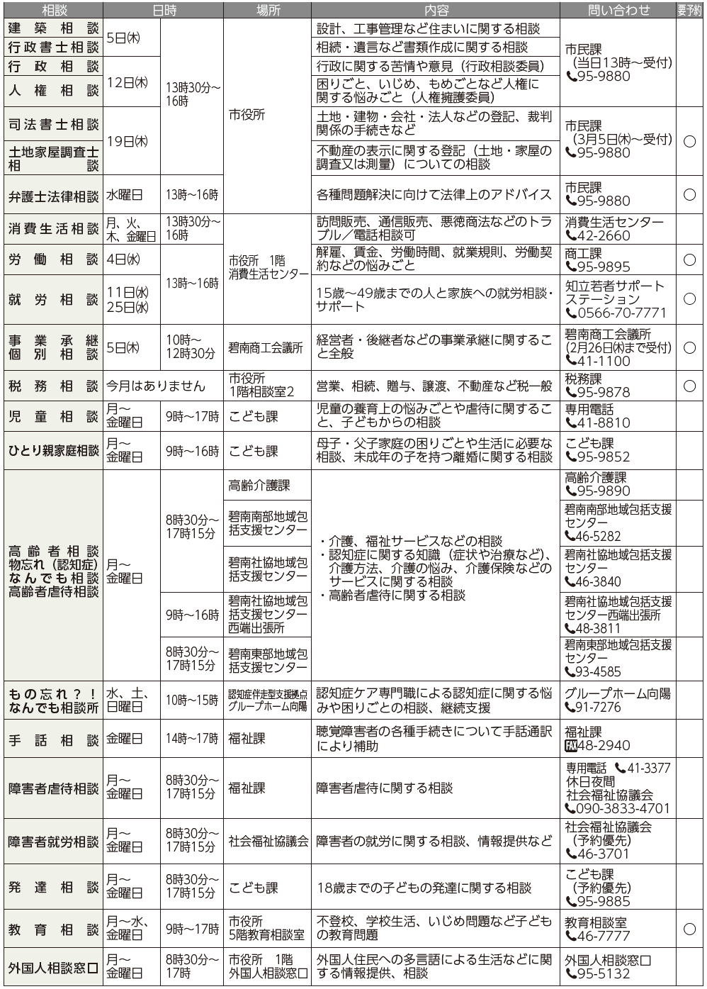 くらし 3月相談 51/53 前の記事 次の記事 発行日 : 2026年02月01日 自治体名 : 愛知県碧南市 広報紙名 : 広報へきなん 2026年2月号 №1975 ※いずれも無料で、施設休館日は休みです。一部の相談は先着による定員制です。 Tweet シェアする 3月保健だより すいすい水族館
