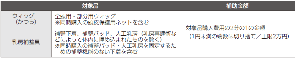 がん治療により、外見の変化による身体的・精神的な負担や社会生活上の不安を持つがん患者の人に、ウィッグや乳房補整具の購入費用の一部を補助します。申請に必要な書類など、詳しくはホームページを確認してください。