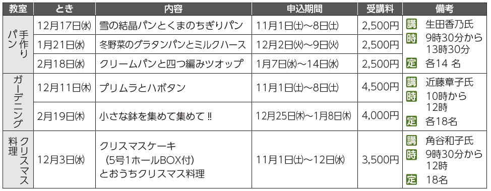 ・受講費は全て材料費を含む(材料費は変動する場合あり)