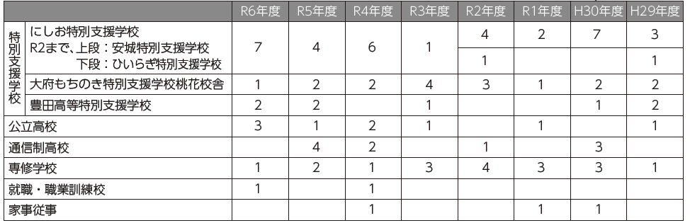 過去8年間、碧南市内中学校の特別支援学級を卒業した生徒の進路は、上の表のとおりです。