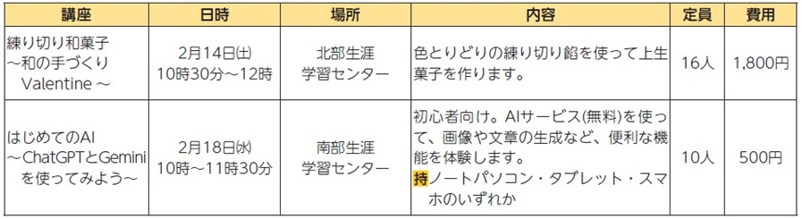 申込み:1月20日(火)(必着)までに、講座名、申込共通事項、年齢、勤務先または学校名(市外の人)をQR、ハガキ(1講座1枚)または直接、各センターへ。