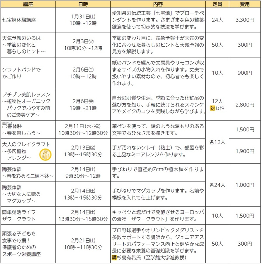 申込み:1月15日(木)(必着)までに、申込共通事項、年齢(学年)、勤務先または学校名(市外の人)をQR、ハガキ(1講座1枚)または直接、総合文化センター(〒448-0858 若松町2-104)へ。