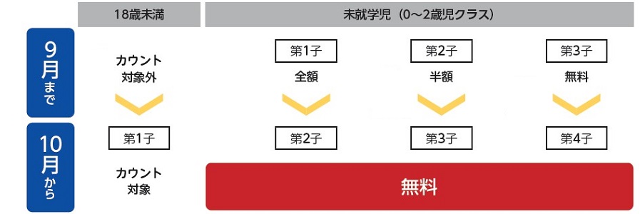 10月から、市独自の取組として、生計を一にする18歳未満の子を全てカウントし、世帯収入にかかわらず、第2子以降の保育料が無料となります。手続きは原則不要ですが、きょうだいが別居している場合などは別途手続きが必要になることがあります。