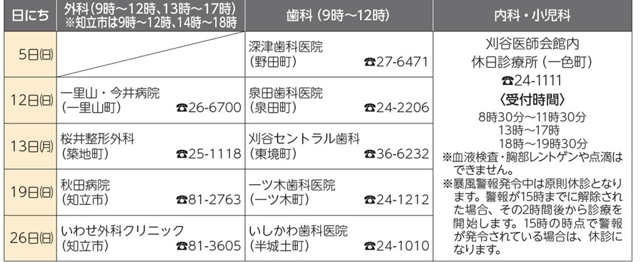・日曜などの診療時間外および平日の夜間に急病・けがなどでお困りの場合は、かかりつけの医師へ連絡し、不在のときは救急医療情報センター【電話】36-1133へ問い合わせてください。