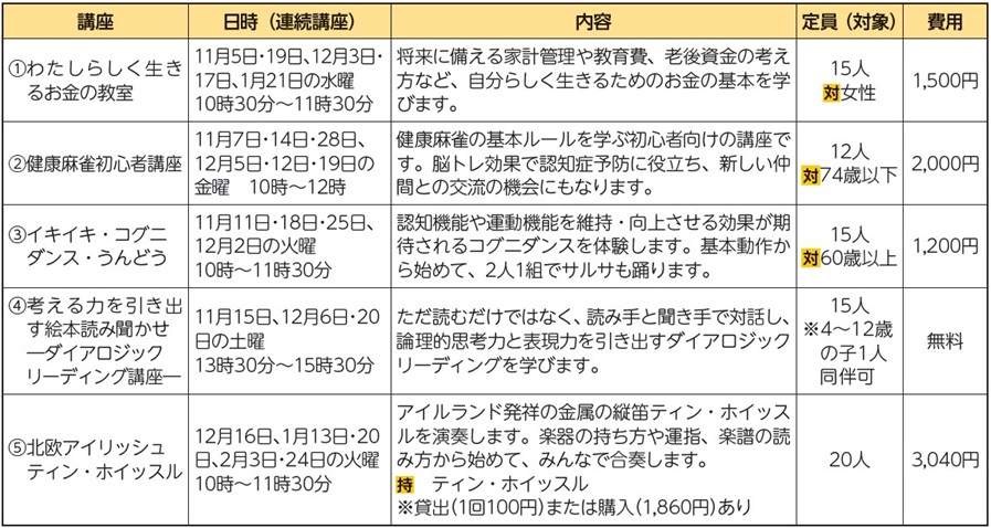 申込み:10月10日(金)から31日(金)までに、募集要項を確認し、来館日時を【電話】21-7464で予約の上、必要書類(生涯学習課・総合文化センターで配布、市HPでダウンロード)を直接、総合文化センターへ。提出時に簡単な面接を行います。