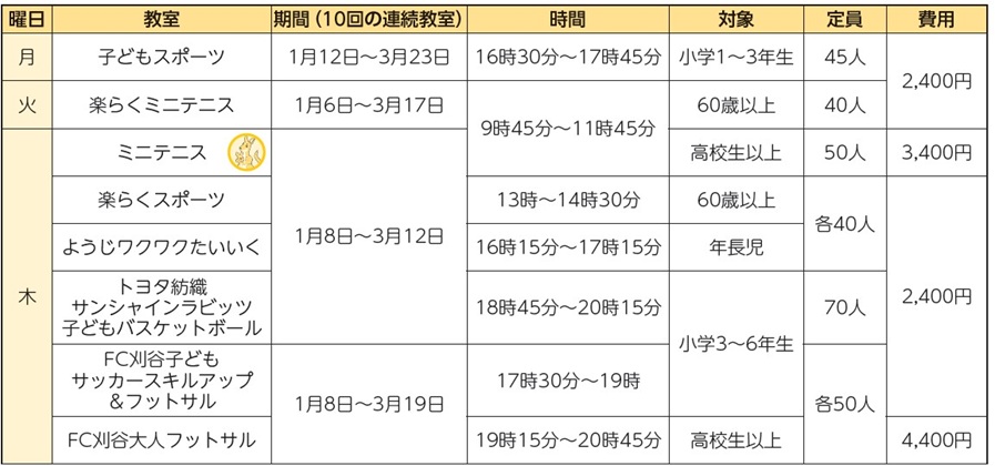 ・往復ハガキの往信部裏面に教室名(1人1枚1教室)、申込共通事項(電話番号は自宅・携帯)、性別、生年月日、年齢、勤務先または学校名・学年、保護者氏名(小学生以下)、緊急連絡先(住所、氏名・フリガナ、続柄、電話番号)を、返信部表面に郵便番号・住所、氏名、教室名を記入し、郵送または直接、ウィングアリーナ刈谷(〒448-0011 築地町荒田1、休館日…水曜)へ。