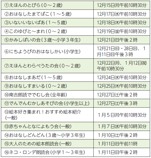図書情報館及び公民館図書室等サービスポイントの年末年始の休館に伴い、12月15日(月)~28日(日)の貸出分は、図書の貸出期限が平常の2週間から3週間に延長されます。