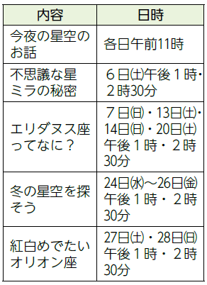 その他:21日(日)午後2時30分~4時30分は特別投映クリスマススペシャル「太陽になりそこなった星“木星”」を投映(大人500円、小中学生300円、幼児250円)