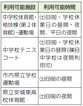 ※中学校施設の(土)(日)の昼間については、優先利用団体が利用しない時間帯に限り、中学校施設開放利用団体へ開放します。