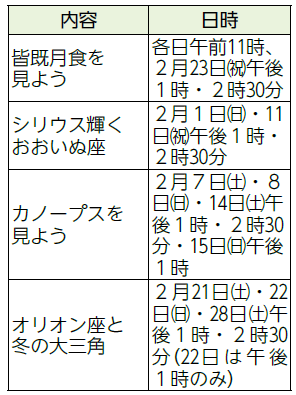 その他:22日(日)午後2時30分~4時は特別投映あんプラスペシャル「今年注目の天文ショー」を投映(大人400円、小中学生200円、幼児150円)