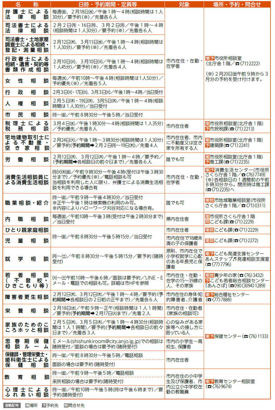 くらし 〔相談窓口〕2月1日~3月14日分 32/39 前の記事 次の記事 発行日 : 2026年02月01日 自治体名 : 愛知県安城市 広報紙名 : 広報あんじょう 令和8年2月号 各分野の専門職が相談に応じ、秘密は固く守ります。相談業務は正午~午後1時(消費生活相談員による消費生活相談、若者相談は除く)、(祝)(休)は休みます。 Tweet シェアする Information 〔すくすくスクエア〕妊婦や乳幼児を対象とした各種教室・相談