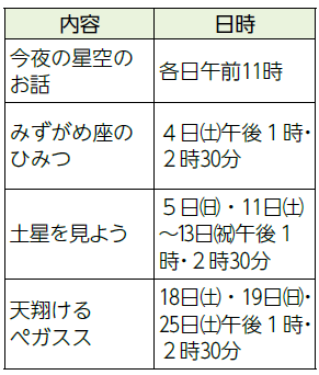 その他:26日(日)午後2時30分~4時は特別投映、音楽の星空「星月夜(ほしつきよ)~祈りの歌が響く時~」を投映(大人500円、小中学生300円、幼児250円)