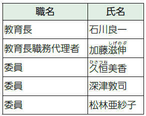10月1日より、松林亜紗子氏(任期:令和11年9月30日まで)が新たに教育委員会委員となりました。教育委員会委員の名簿は、下表のとおりです。