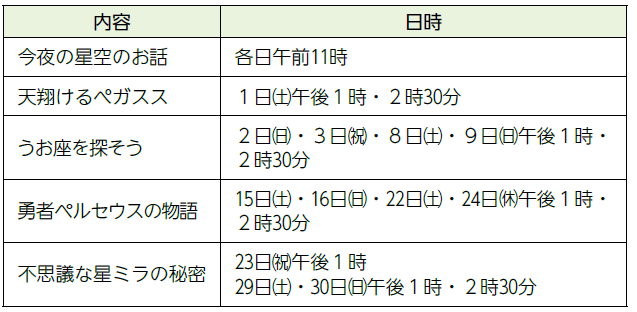(土)(日)(祝)に投映(星空解説+各番組)を行います。投映スケジュールは市HPを参照するか、問い合わせてください。