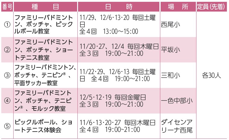 申込・問合先:11/4(火)~14(金)に申込書をスポーツ振興課(【電話】54・0002/【FAX】57・1321/【Eメール】[email protected])へ。