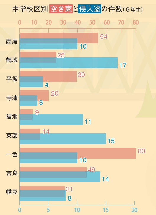 ▽中学校区別 空き家と侵入盗の件数(6年中)
