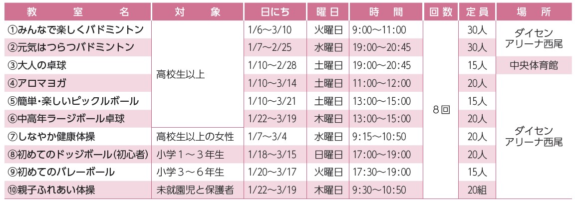 申込:12/1(月)~9(火)に、本紙15ページ掲載のコードで。または申込書をダイセンアリーナ西尾へ。申込書は同アリーナで入手可