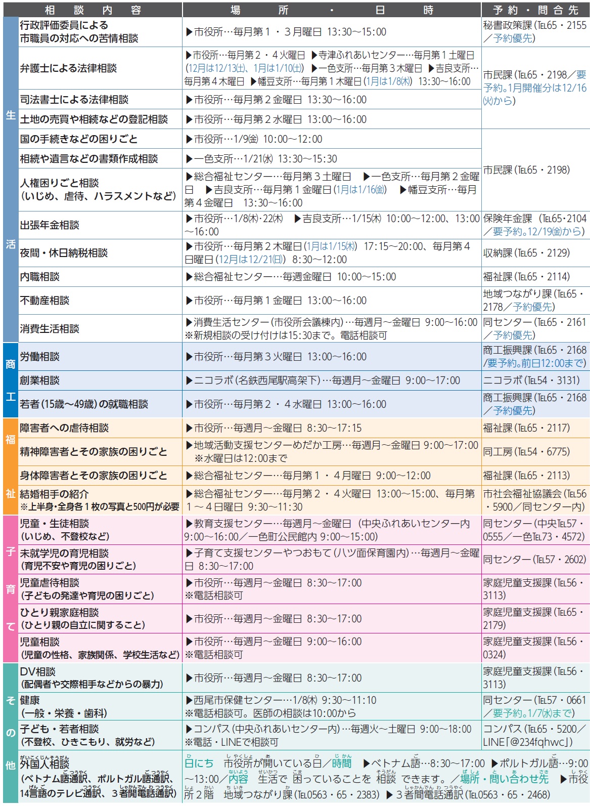 ※西尾警察署「住民コーナー【電話】57・0110」や名古屋法務局西尾支局「人権相談【電話】57・2622(毎週水・木曜日10:00〜16:00)」、西三河県民生活プラザ「法律相談【電話】0564・27・0800(毎月第2水曜日14:00〜15:00/要予約)、西尾保健所「こころの健康医師相談【電話】56・5241(毎月第3木曜日14:00〜16:00/要予約。前日まで)」もご利用ください。