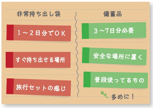 非常持ち出し袋は「避難するときに持ち出すもの」、備蓄品は「自宅で避難生活を続けるためのもの」です。