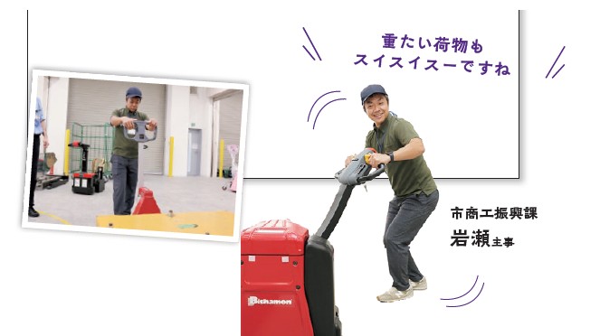 力の弱い人でも安全・簡単に重量物を運搬できる、ハンドパレット製品の操作を体験。操作の説明を聞きながら、ふと持ち上げたテスト用重量物の重さが1.5tと聞いてびっくり。安全性や耐久性へのこだわりを持ちながらも、使う人への優しさをとことん追求する、従業員の熱い思いが伝わってきました。