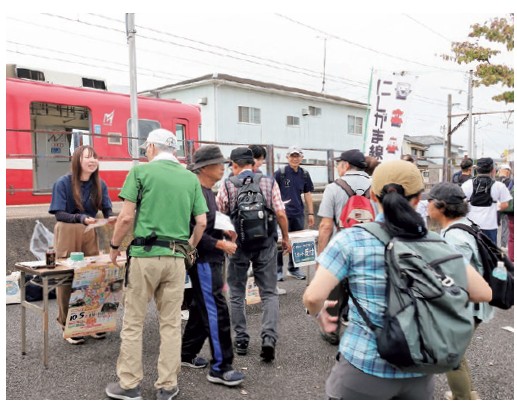 名鉄吉良吉田駅~西幡豆駅を歩く海沿いのコース。汗ばむほどの陽気の中、参加者は海風に当たりながら爽やかな笑顔を見せていました。